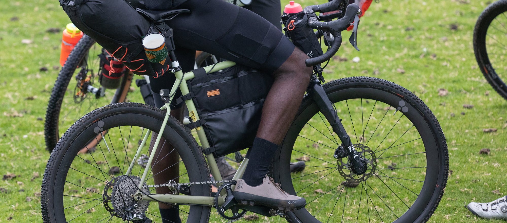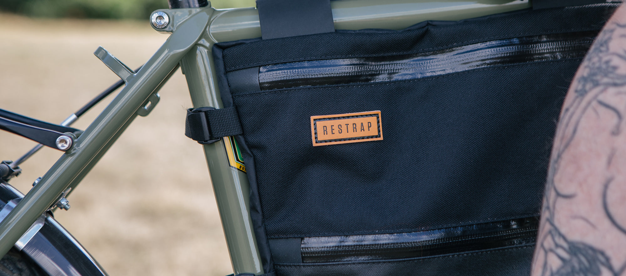 A large black full frame bag attached to a bicycle frame, with adjustable straps and a Restrap label visible.